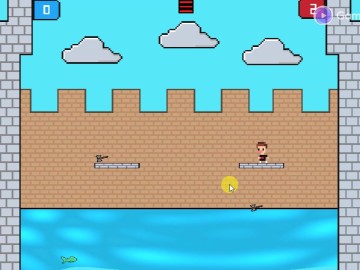 um Punkte zu erzielen, indem man den Gegner mit einem Axtwurf auf sich bewegende Plattformen trifft Wer 5 Punkte erreicht, gewinnt das Spiel